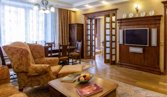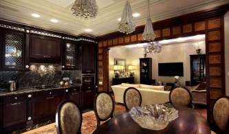 Центральное место в трехкомнатной квартире занимает большая гостиная, объединенная со столовой и зоной камина. Через открытый дверной проем она соединяется с небольшой удобной кухней. Две спальни имеют правильные пропорции и максимально удалены от общественной части.
