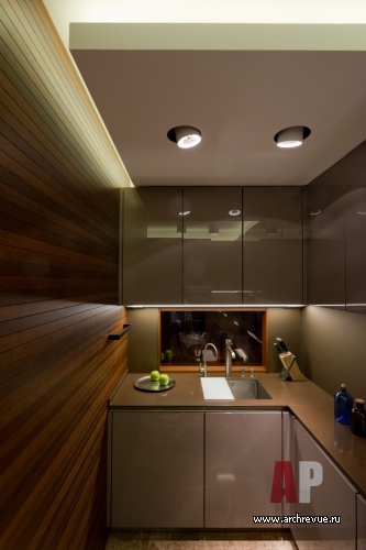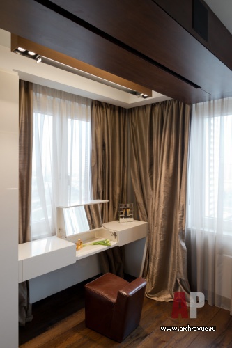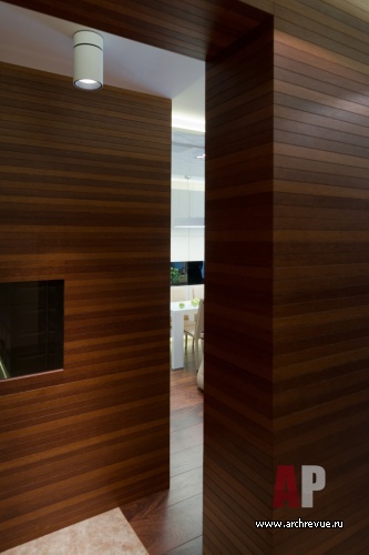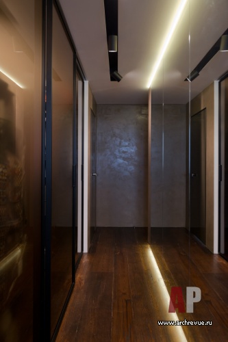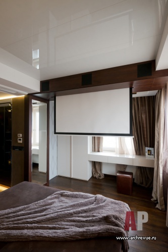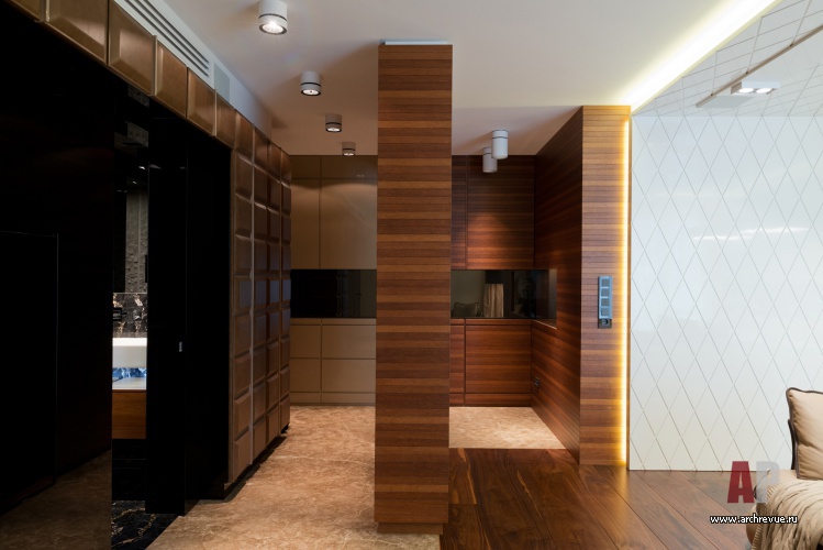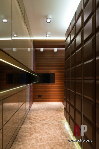 Каждое помещение в квартире насыщено разнообразными функциями, необходимыми для современного горожанина. Длинный коридор обыгран как встроенные системы хранения, расположенные по обе стороны помещения. Шкаф с камином представляет собой еще более технически сложное изделие – в нем спрятаны: акустические колонки, датчик увлажнителя, биокамин, оборудование для домашнего кинотеатра, винный стеллаж. В спальне помимо зоны отдыха, будуара и гардеробной спроектирована система домашнего кинотеатра с выдвижным экраном.