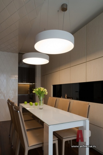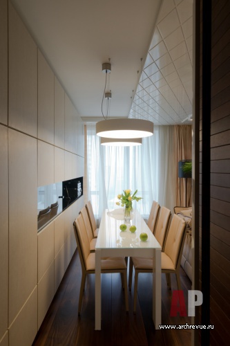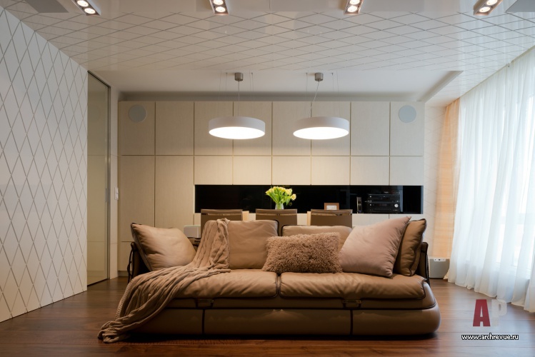 Поэтому характерная особенность проекта – максимальное насыщение функцией каждого квадратного метра площади при сохранении простора и воздуха. В дизайн-проект заложено много мест для хранения разнообразных предметов, которые скрыты от глаз за лаконичными поверхностями встроенной мебели. С точки зрения дизайна интерьер решен как великолепный набор декоративных рам, которые зонируют помещение, создают интересные видовые точки и делают пространство сложным и эффектным.