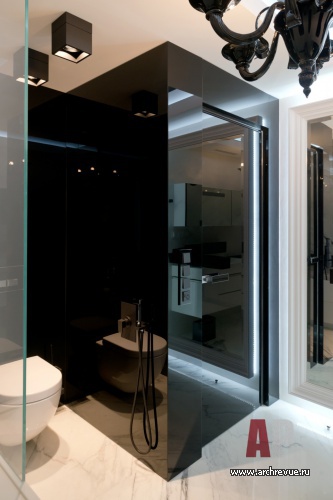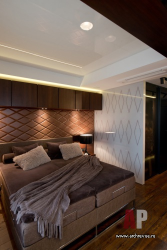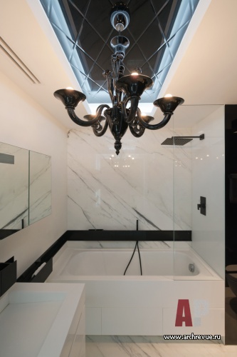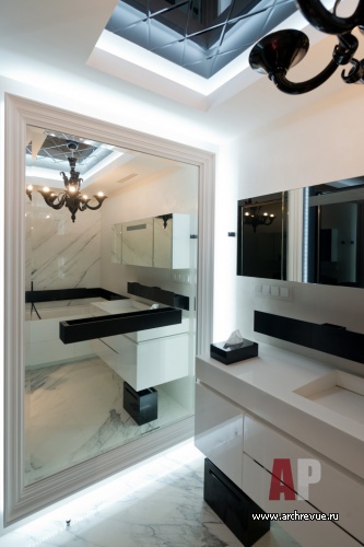 Необычайно эффектно выглядит конструкция из МДФ-панелей, выкрашенных в белый глянец, в гостиной, не случайно названная авторами проекта «Арлекино». Тема декоративных ромбов продолжается в приватных помещениях хозяйской спальни. В отделке интерьера преобладают натуральные материалы: мрамор, дерево, кожа. Практически вся мебель создана по индивидуальным эскизам и чертежам архитекторов под проект.