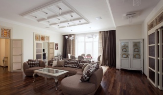 Монументальность интерьеру общественной зоны придают современные и неоклассические светильники больших размеров, они выгодно подчеркивают высоту потолков помещения. Актуальность интерьера подчеркивают перегородки из прозрачного стекла и изделия из металла. Облик современного комфортного жилья завершает лаконичная мебель из последних коллекций европейских производителей.