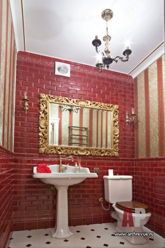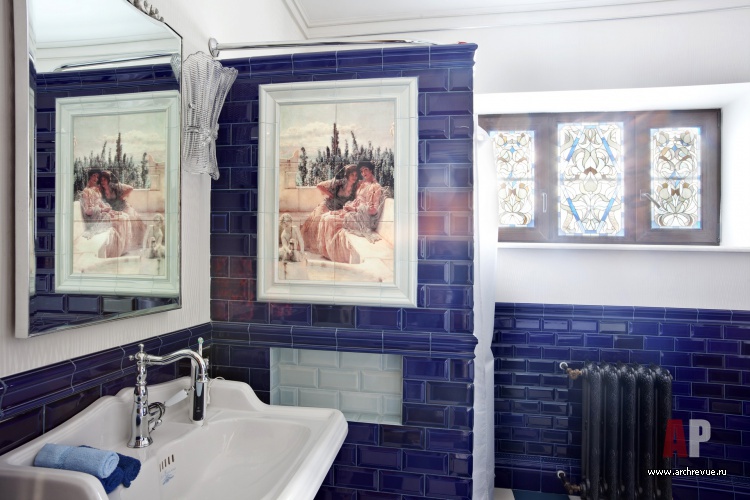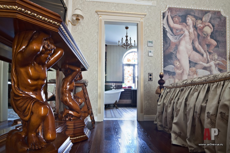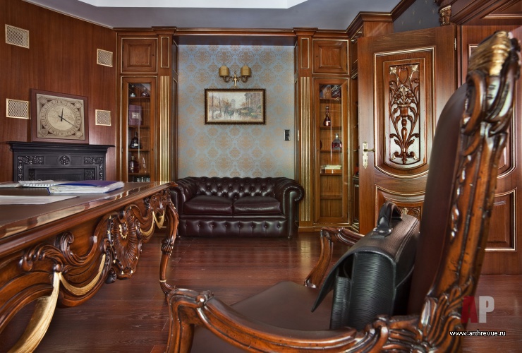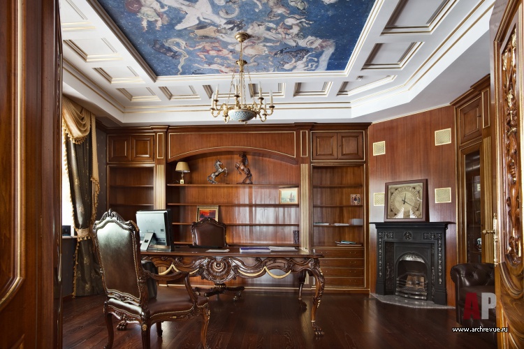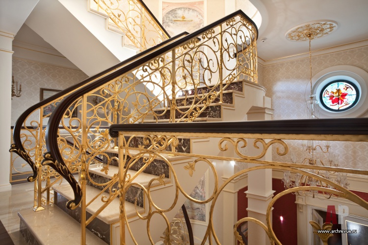 Когда архитекторы познакомились с заказчиком, на участке уже стояла бетонная «коробка» трехэтажного дома с чистовой отделкой помещений. Владелец поставил задачу декорировать его интерьеры, придав дому парадный вид в стиле традиционной классики с английскими мотивами. В процессе работы проект все больше приобретал черты помпезного неоклассического особняка: к деревянным панелям, витражам, керамике добавились лепные карнизы и молдинги, фрески и золочение.