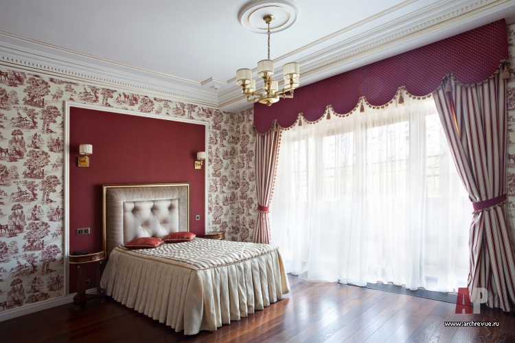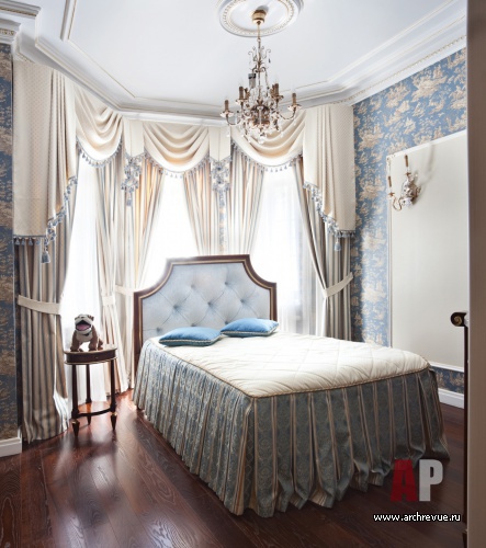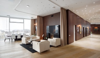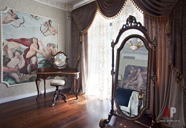 Холл, гостиная и спальни выполнены в неоклассике с французскими мотивами. Парадная лестница украшена кованым золотым ограждением, потолки и стены декорированы лепными молдингами, карнизами и розетками с золочением, полы выстланы мраморной плиткой с инкрустацией. Текстильный дизайн выполнен по историческим образцам с использованием роскошных тканей и текстильных обоев.