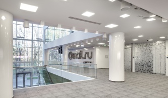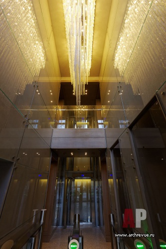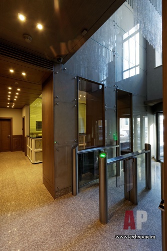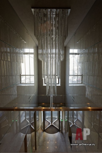 Высоту помещения акцентирует каскадная люстра, созданная по дизайну архитектора Леонида Зайцева. Два верхних этажа занимают рабочие помещения руководителей компании. Одни из них решен как трансформер и представляет по сути единое пространство: два кабинета и расположенная по центру переговорная отделены друг от друга трехметровыми дверями, которые при необходимости складываются в ниши и открывают впечатляющую анфиладу. На верхнем, мансардном этаже расположена зона для неформального общения и отдыха. Из зала с камином, домашним кинотеатром и белыми кожанами диванами можно попасть на остекленную веранду, откуда виден храм Христа Спасителя.