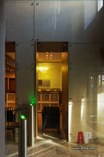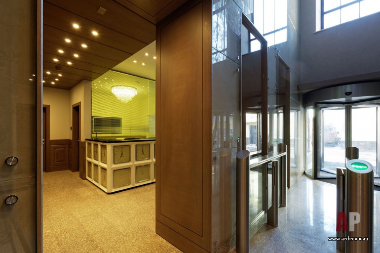 Входная группа с револьверной дверью, турникетами системы безопасности, лифтами и стойкой ресепшен решена как атриум. Стены авторы проекта оформили декоративной фактурной штукатуркой, а сверху закрыли стеклянными панелями, получив интересный эффект: будто сквозь технологичное стекло просвечивают конструкции исторической постройки. Этот прием придает интерьерам благородный вид и дополнительный визуальный объем.