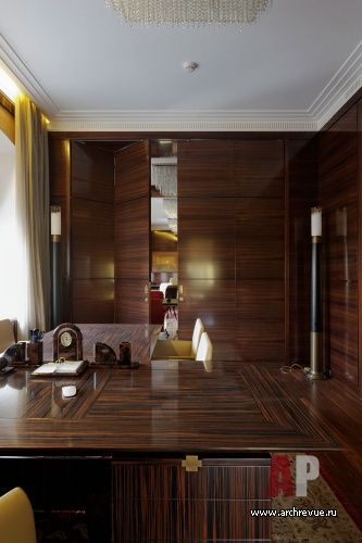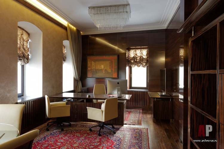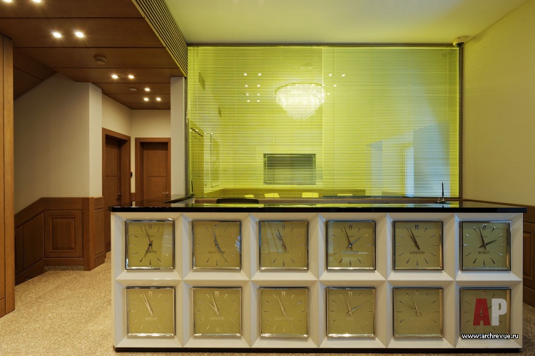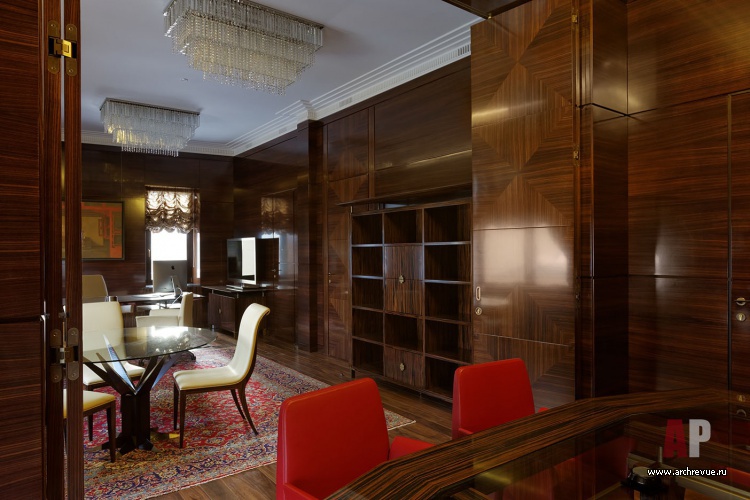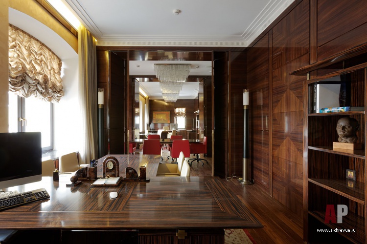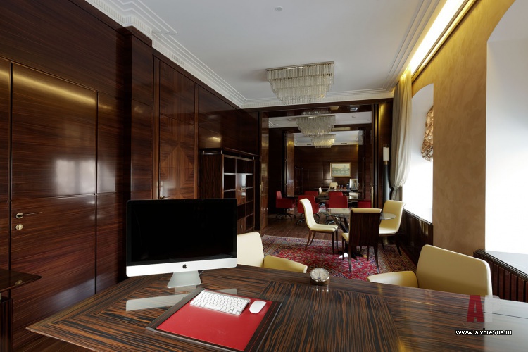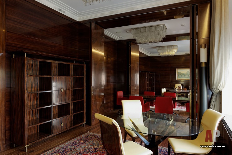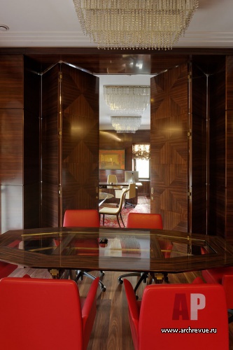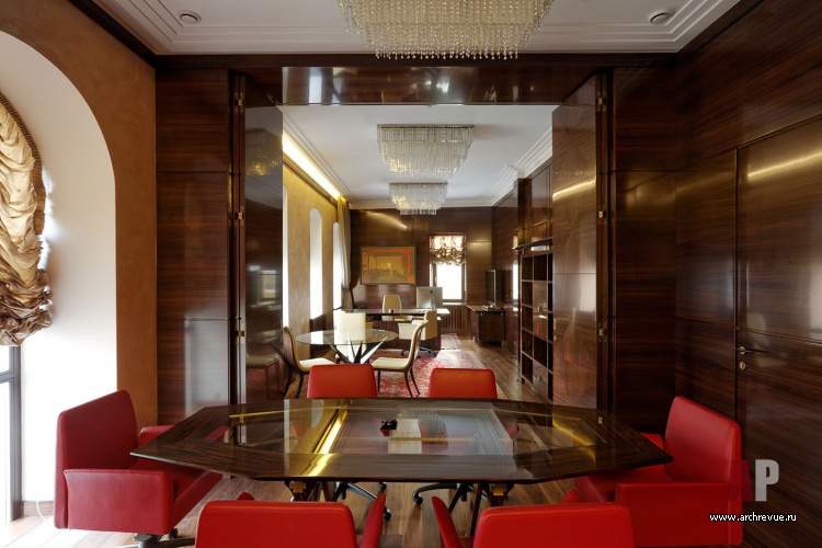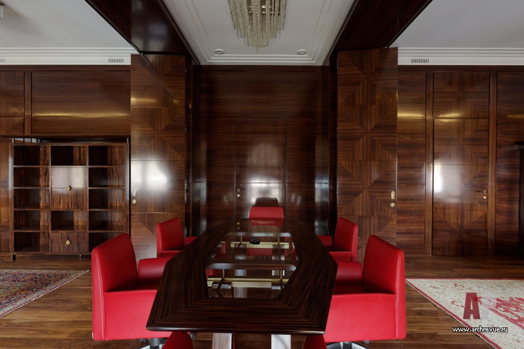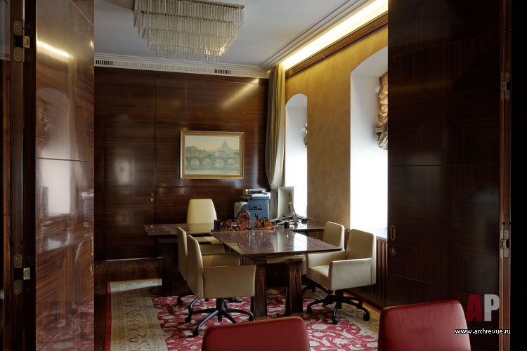 Если входная группа офиса – дань современным новаторским технологиям и урбанистическому дизайну, то представительские помещения – элегантная реконструкция стиля ар-деко. Рабочие кабинеты руководителей декорированы роскошными палисандровыми панелями (за некоторыми из них скрываются функциональные ниши и двери в соседние помещения), полы выстланы древесиной американского ореха, яркие предметы мебели выполнены из эбенового дерева и натуральной кожи бежевого и красного цвета.