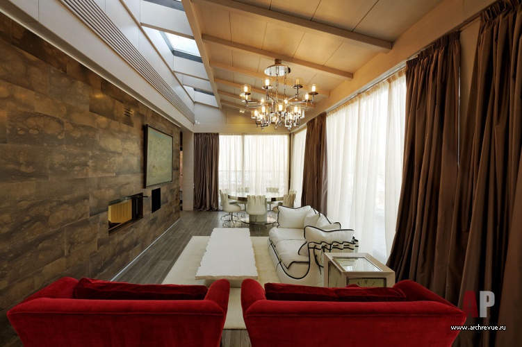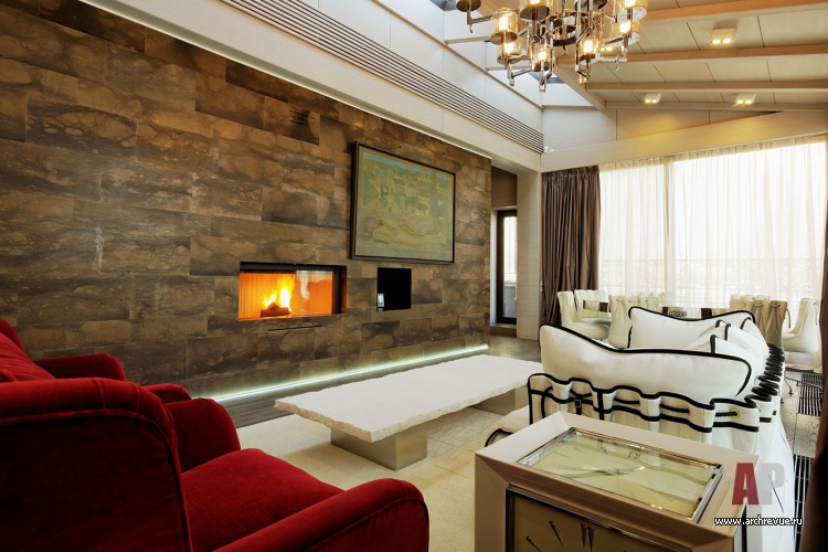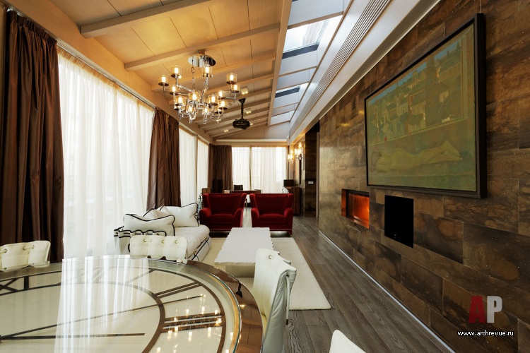 На подоконниках авторы использовали натуральный мрамор, который вместе с воздушными римскими шторами создает богатый рисунок. Классическую наполненную светом анфиладу подчеркивают выстроенные на одной линии каскадные светильники строгой геометрии с хрустальными подвесками. Мансардный этаж выполнен в духе роскошного клуба с камином, который облицован бежевым мрамором, дизайнерской мебелью, бархатными шторами и профессиональным акустическим оборудованием.