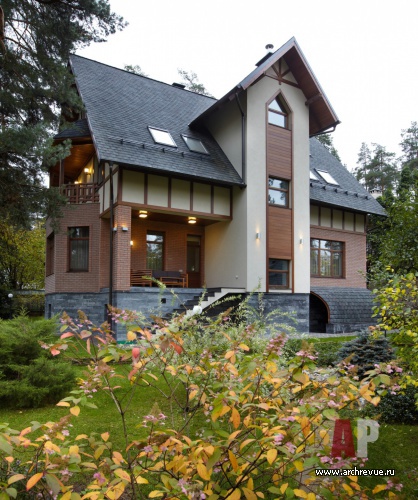 Фасад дома оформлен в строгом стиле: цоколь облицован серым сланцем, первый этаж отделан клинкерным кирпичом, вертикаль лестницы и второй этаж оштукатурены и дополнены фахверковой раскладкой из дерева. В оформлении жилых помещений акцент сделан на природную цветовую палитру и натуральные материалы: камень, дерево, штукатурки, фактурные ткани. Особый колорит интерьерам дома придают этнические марокканские и японские мотивы, которые архитектор мастерски вплетает в современную стилистическую канву.