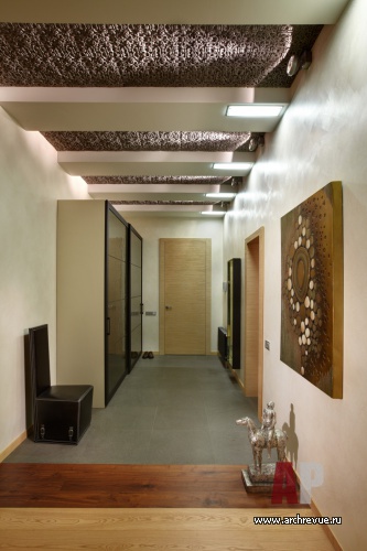 Разные по функции интерьеры дома объединены общей концепцией оформления, в основе которой природная, приятная глазу колористика, натуральные материалы с «живой» фактурой и лаконичная современная мебель. Так, полы жилых комнат выстланы массивной брашированной доской из ясеня под маслом. С теплыми светлыми полами гармонируют декорированные серо-бежевой штукатуркой стены.