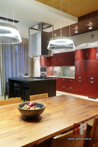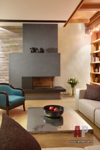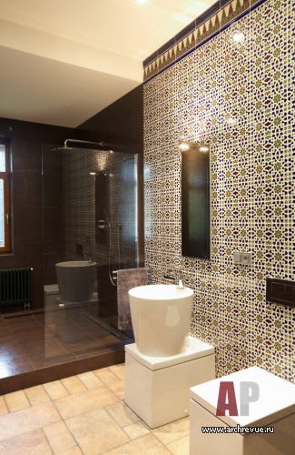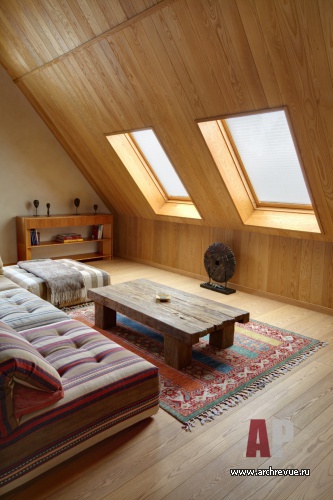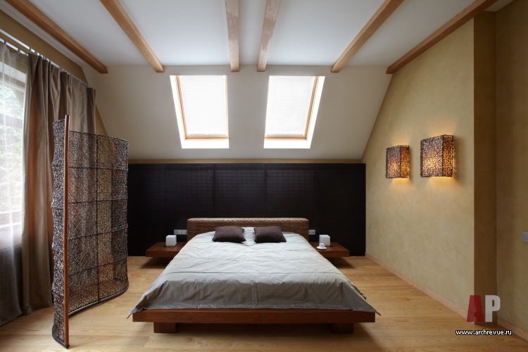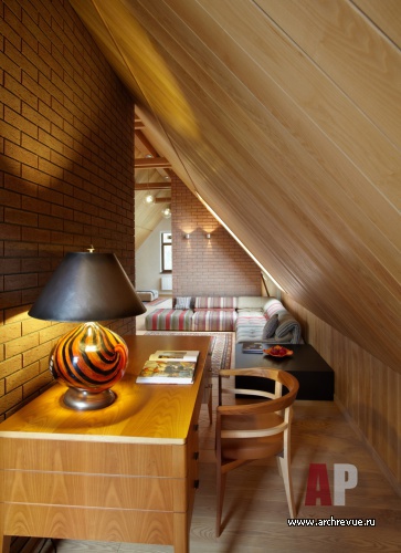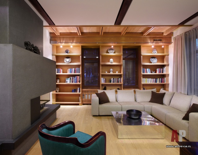 Мокрые зоны (прихожая, ванные, лестница) облицованы темно-серым базальтом. Созданный по эскизам автора проекта современный камин с широким дымоходом и длинной топкой оформлен слэбами серого базальта. Стена за камином выложена кварцитом. Яркие ноты в охристо-сером спокойном интерьере гостевых помещений: брусничная лакированная кухня, красный диван и бирюзово-зеленое кресло. Аскетичные спальни выполнены в японской манере, об этом говорит строгая геометрия, контрастные цвета, заниженные формы, занавеси в виде раздвижных панелей, декоративные решетки из дерева и ширмы. Приватная, «марокканская» гостиная, напротив, решена пышно и нарядно: ее потолок расписан вручную арабским орнаментом с растительными мотивами, потолок подпирают декоративные колонны из оселкового мрамора, а на кожаных диванах и креслах – разноцветные подушки. Облик мансарды формирует теплый ясень, которым обшиты крутые скаты кровли, и клинкерный кирпич, использованный в отделке дымохода.