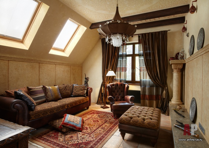 Зона отдыха второго этажа (марокканская гостиная) диван, кресло, пуф Mantellassi, поставщик «ТРИО-Интерьер»