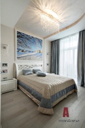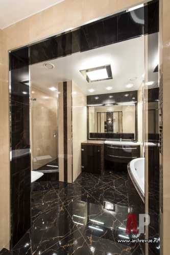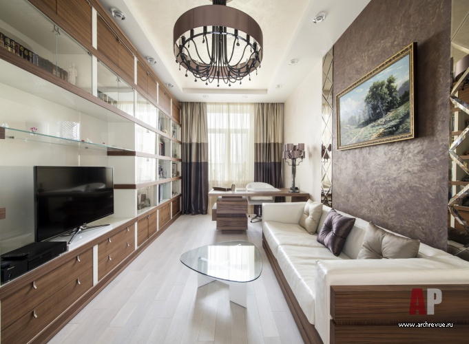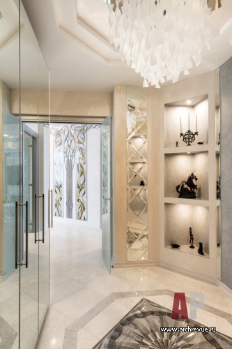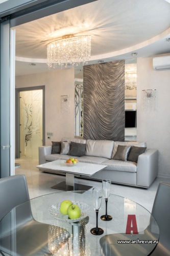 Интерьер семейной квартиры выглядит легким и воздушным за счет использования пастельной цветовой гаммы, перегородок из стекла, светлого керамического гранита под мрамор, которым выложены полы в гостевых помещениях. Благодаря финишным покрытиям с эффектом жидкого шелка, зеркалам с фацетами и светильникам с подвесками из нитей кристаллов Svarovski он наполняется нематериальным сиянием и красивыми солнечными бликами.