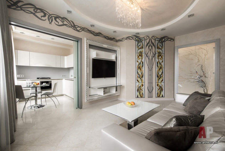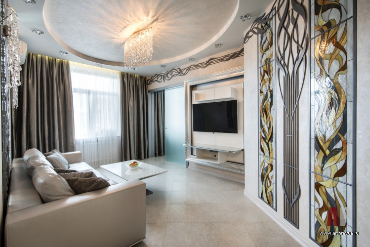 Автор проекта предложила дизайн-проект с богатой палитрой серебристых, жемчужных и бежевых оттенков, ключом к интерьерному образу стала художественная композиция из цветных витражей в технике Тиффани и кованого металла с орнаментом в стиле модерн в современной интерпретации.