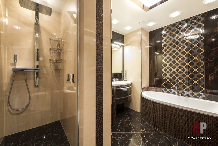 В итоге на левой половине квартиры расположилась гостиная сложной конфигурации, которая объединена с кухней с помощью раздвижных перегородок из стекла. Благодаря такому приему две разные по назначению зоны соприкасаются друг с другом, но при необходимости превращается в полностью изолированные помещения. С непростой формой гостиной перекликается многоугольник прихожей. Квадратное помещение с помощью угловых ниш и вставок из зеркал с фацетами дизайнер превратила в геометрически сложное и внешне очень эффектное помещение. На правой половине расположены: хозяйская спальня, детская комната, кабинет. В темной части квартиры находится ванная комната и гардеробная.