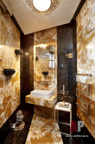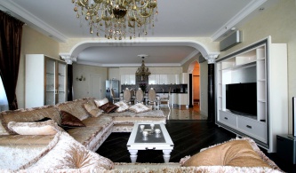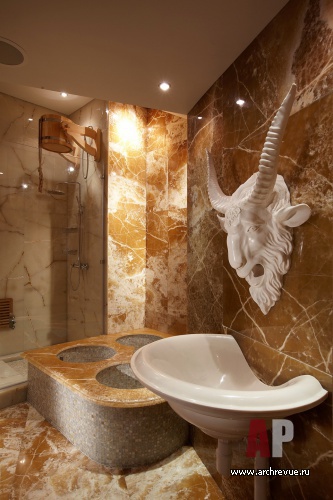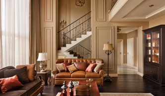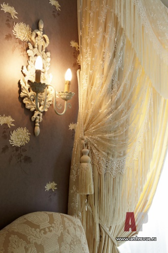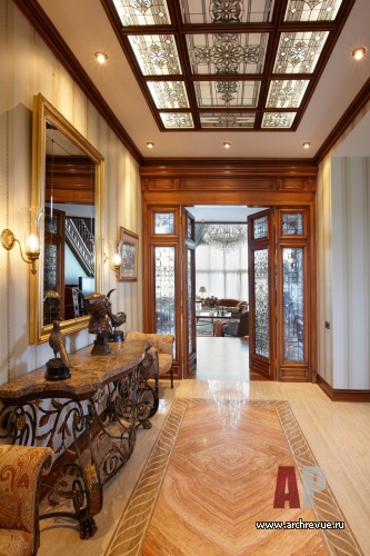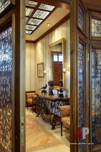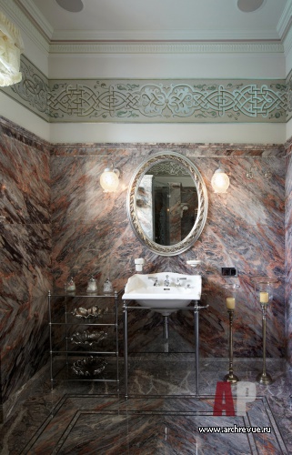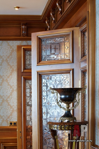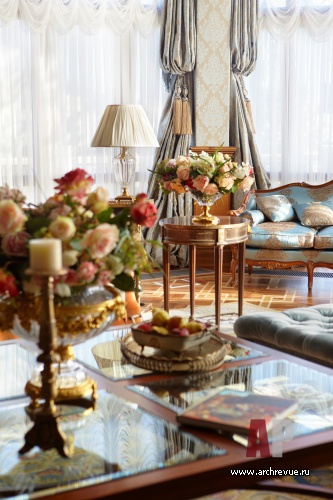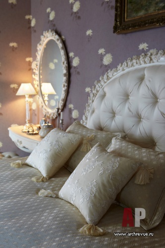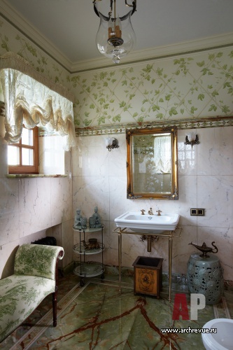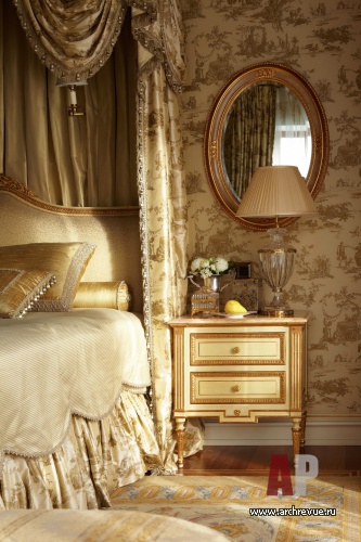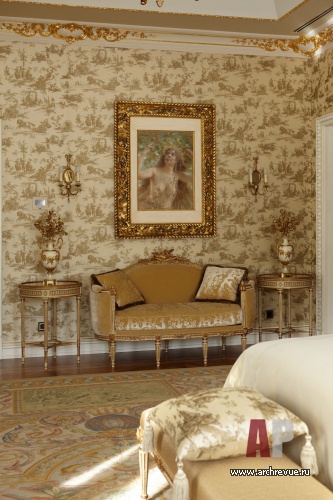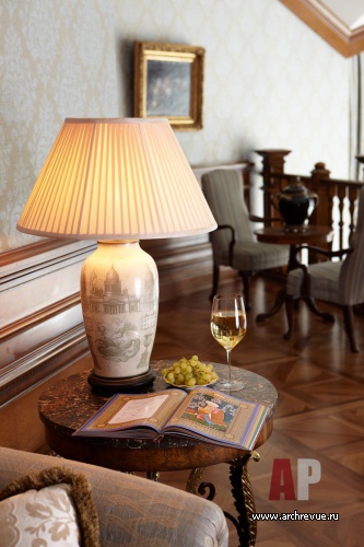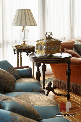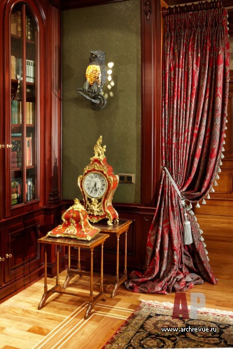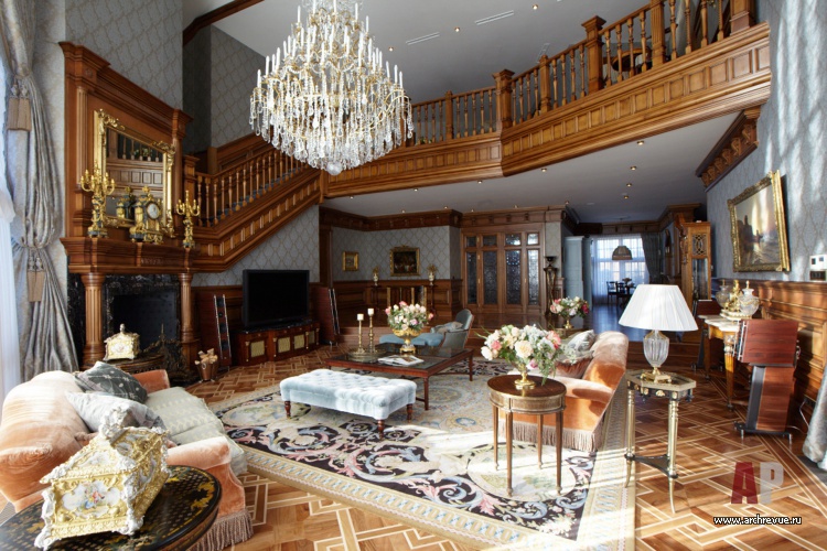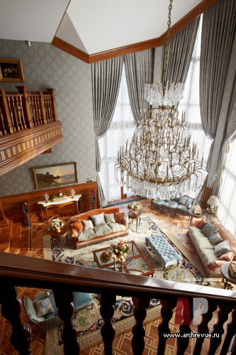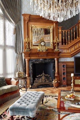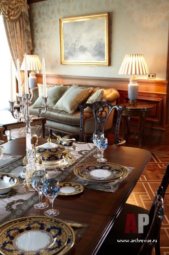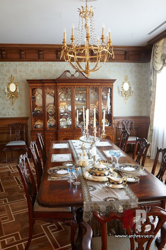 Столовая исполнена в стиле «Чиппенддейл», спальня – в георгианском стиле, гостевая – в викторианском, а роскошная бильярдная благодаря кессонным потолкам из дерева с керамическими вставками и гобеленам вовсе выглядит иллюстрацией к готическому роману. Важную роль в создании подлинной английской атмосферы играет фактура материалов, орнамент декоративных изделий и текстиля, а также выбор цветовой гаммы: королевский голубой, золотисто-медовый, бирюзовый и жемчужно-серый.