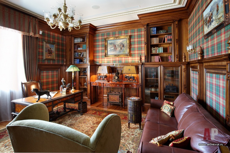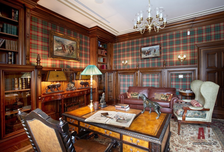 В проекте присутствует все многообразие декораторских решений и приемов, которые ассоциируются с традиционной английской классикой: столярные изделия из темного дерева, тканевые стеновые панели, бумажные и текстильные обои с характерным орнаментом (цветы или шотландская клетка), кожаная мебель. Каждое помещение оформлено в своей уникальной стилистике.