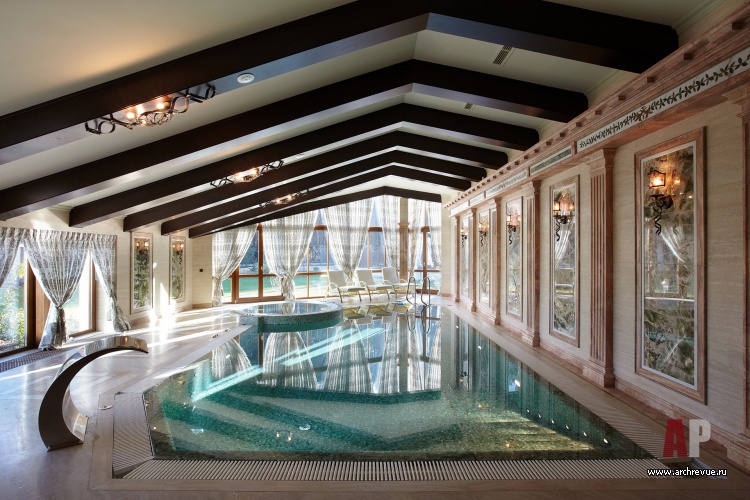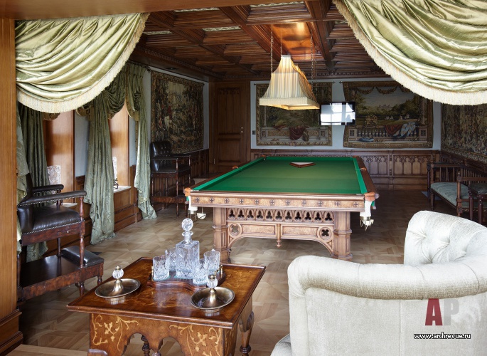 Характерная особенность организации пространства – большое количество разнообразных уютных зон – приватных гостиных, диванных групп и т.д. для отдыха и бесед. К основному зданию примыкает двухэтажное строение развлекательного комплекса, где помимо бассейна, зоны SPA, салона красоты и гостевых спален находится бильярдная, оформленная в стиле неоготики.