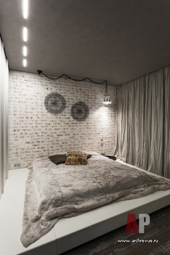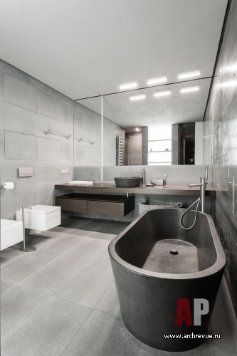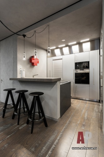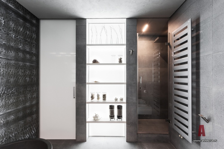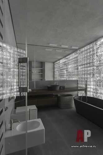 Интерьер минималистичного лофта выглядит брутальным за счет использования в оформлении стен и потолков декоративных финишных штукатурок, имитирующих бетон. С серыми поверхностями сочетаются белые плоскости встроенной мебели и раздвижных стеклянных дверей, а также винтажная массивная половая доска и кожаная обивка дивана. В ванной комнате на фоне подсвеченных светодиодами панелей из стеклобетона, которыми отделанные стены, каменные ванна и раковина смотрятся как авангардные арт-объекты.