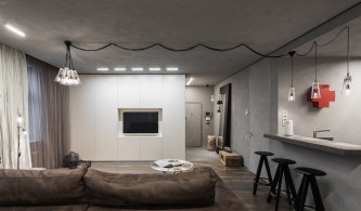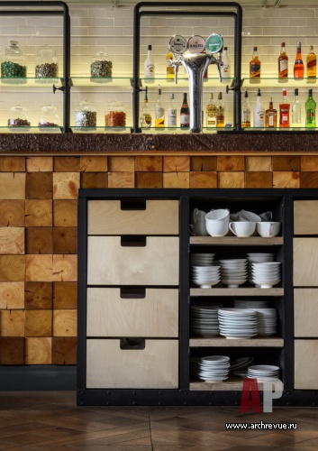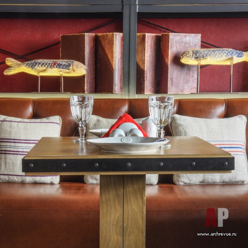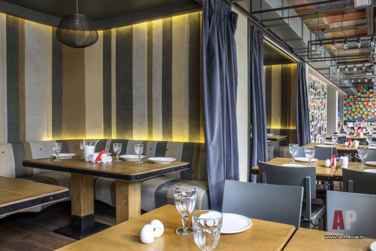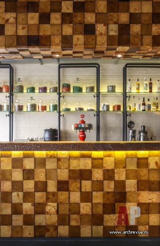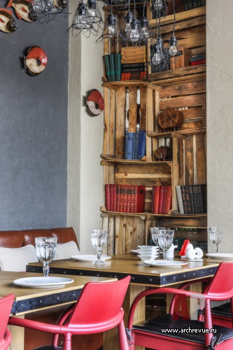 Современный интерьер выглядит ярко и необычно за счет нестандартных авторских решений, сочной цветовой гаммы и оригинальных декоративных предметов. Так, при входе внимание привлекает барная стойка, сложенная из березового бруса разной толщины торцевыми спилами наружу. В узких нишах между колоннами дизайнеры сделали импровизированную библиотеку из грубо сбитых ящиков разной высоты и ширины.