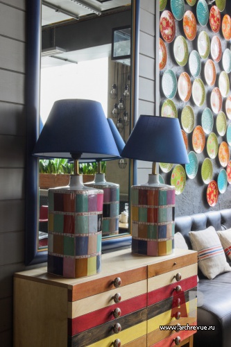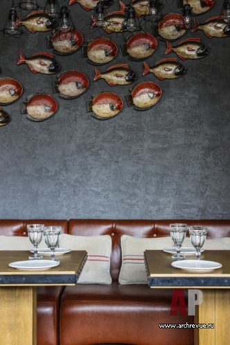 По одной стене «пустили» стаю керамических рыбок, вдоль других выстроили стеллажи с забавными артефактами. А самую дальнюю от входа стену и вовсе превратили в роскошное панно: выкрашенная структурными штукатурками сложного серого цвета поверхность на всю высоту декорирована пестрыми керамическими тарелками оранжевого, голубого и салатового цветов. Облик позитивного кафе завешают мини-огородики на подоконниках и огромные дизайнерские разноцветные вазы.