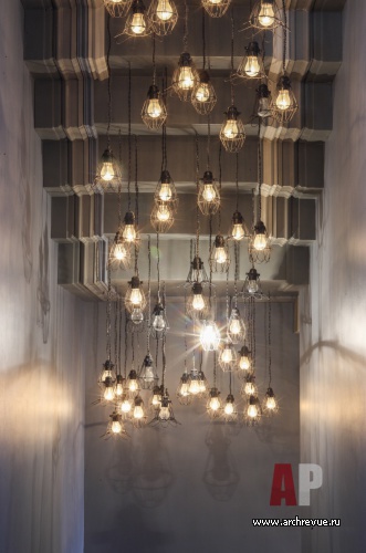 Кафе занимает один просторный зал. Разные по назначению зоны (столики для двоих, места для больших компаний, диванные группы для долгих посиделок и т.д.) визуально отделены друг от друга с помощью оригинальных дизайнерских приемов. В их числе – перегородки в виде огромной библиотеки с книгами из грубо сбитых ящиков разной высоты и ширины, ширмы из работающих на просвет стеллажей с красными вазами и отдельные кабины на подиуме, обставленные диванами и задрапированные тяжелыми портьерами.