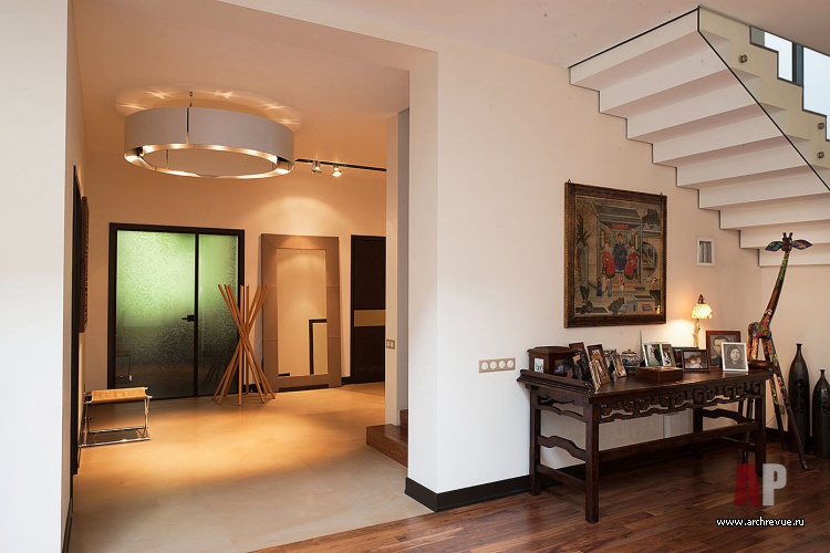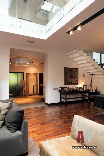Несмотря на обилие стеклянных поверхностей (потолочный световой фонарь, лестница, ограждение второго этажа) современный интерьер выглядит по-домашнему уютным во многом за счет натуральных материалов, светлой теплой колористики и эклектичной мебели. Пространство выглядит масштабным благодаря оформлению стен однотонными покрытиями белого цвета и цвета слоновой кости.