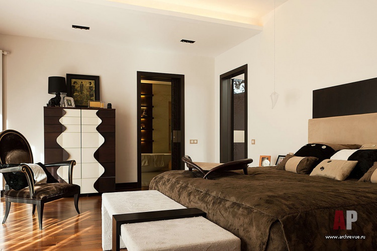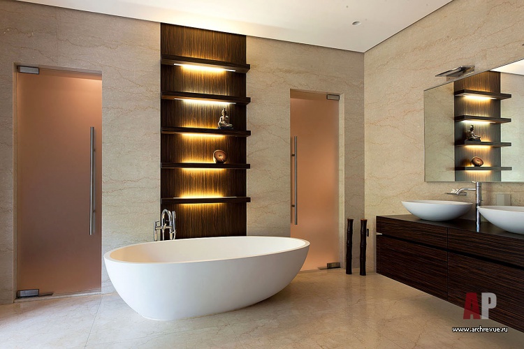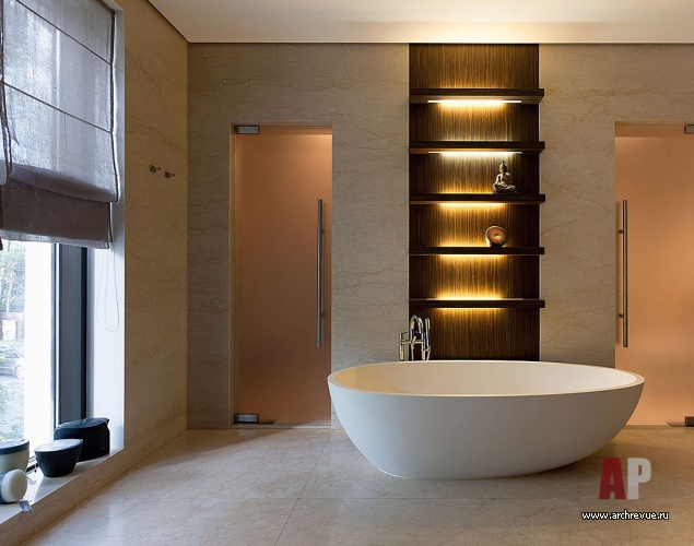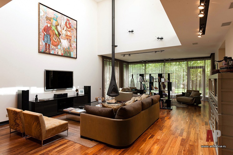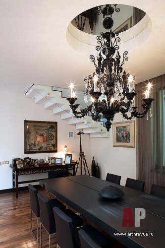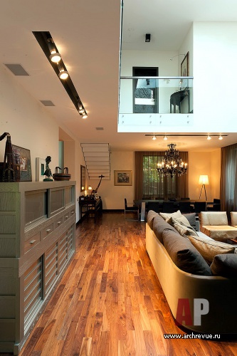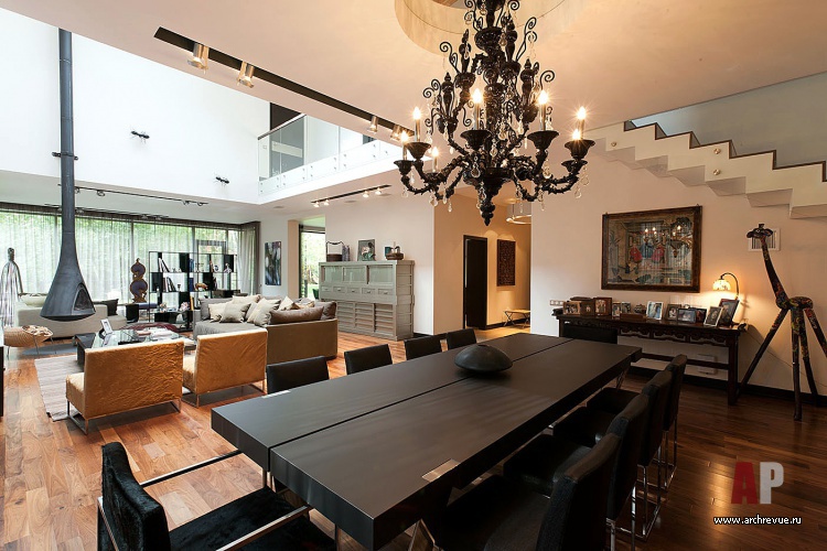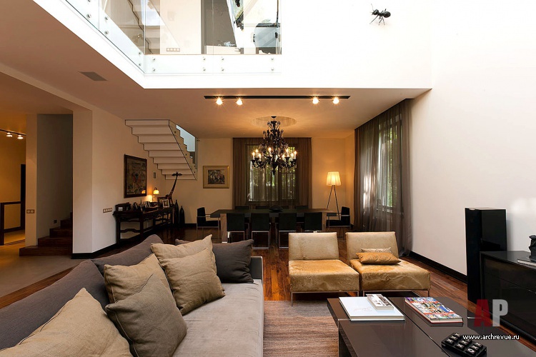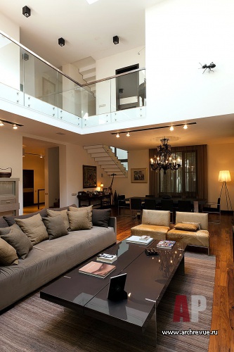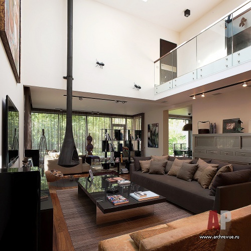 Смысловое и визуальное ядро современного трехэтажного особняка – двухсветная гостиная с роскошным световым куполом, откуда льется дневной свет. Большое, открытое, полное воздуха пространство включает в себя диванную группу, зону домашнего кинотеатра, поворотный камин в стиле хай-тек и столовую группу. Облик гостевой части также формирует стеклянная лестница, втянутая в общий объем одним своим пролетом и расположенный по периметру балкон второго этажа с ограждением из прозрачного стекла.