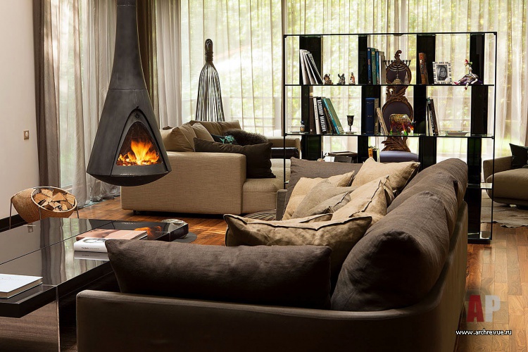 На монохромном фоне контрастно смотрятся декоративные элементы и предметы природных тонов: коричневого, песочного, сливового, цвета мокрого асфальта. Яркая доминанта интерьера первого этажа – металлический поворотный камин в стиле high tech.