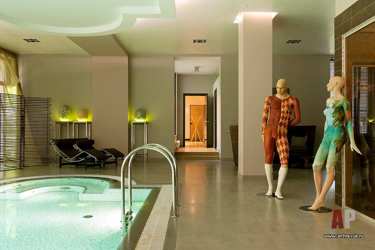 Два верхних уровня занимают приватные помещения хозяев дома: спальни со своими ванными комнатами и гардеробными, кабинет, камерные зоны отдыха. Отдельный объем занимает бассейн с панорамными окнами.