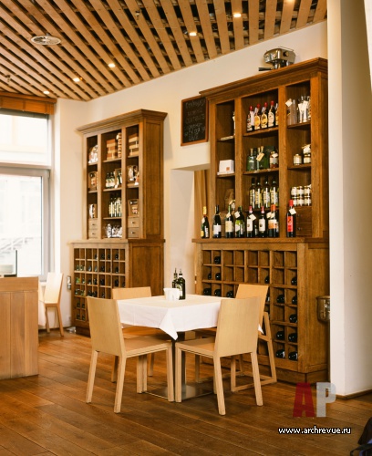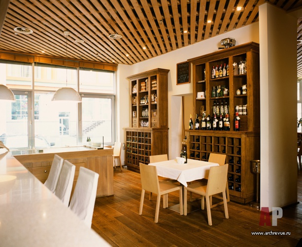 Потолки в залах оформлены перголой из светлого дерева, это декоративный элемент отсылает к средиземноморским интерьерам, наполненным солнечным светом.