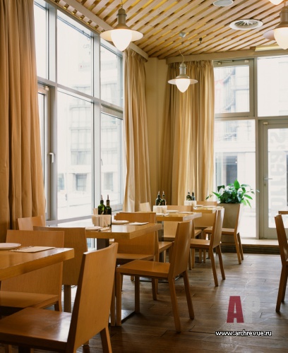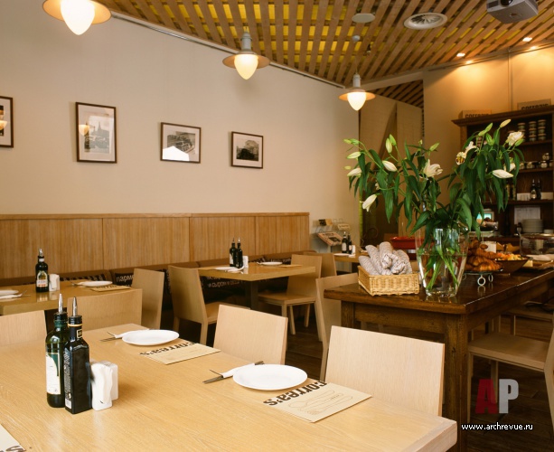 Дизайн-проект городского кафе Correa`s отличается простотой отделки, где важную роль играет натуральное дерево, текстиль и освещение. Кафе расположено в центре Москвы, сквозь панорамные окна видна тихая столичная улица с неспешным движением. Отсутствие суеты, а также теплая сливочно-золотистая цветовая гамма и большое количество естественного света, льющегося из окон, создают умиротворяющую атмосферу.