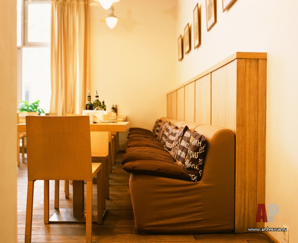 Заведение занимает несколько небольших залов, которые свободно перетекают друг в друга. Открытые дверные проемы стандартной ширины, которая характерна для интерьера квартир, придают кафе сходство с частным жильем. И также работают на создание уютной, камерной, домашней обстановки.