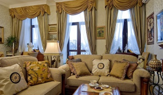 Цветовая гамма и текстура материалов привносят ощущение мягкости. Теплые насыщенные оттенки дерева подчеркивают нежный сливочно-золотистый оттенок стен. Большие окна декорированы льняными шторами цвета топленого молока, летом они вбирают в себя солнечный цвет, а зимой уплотняются, создавая уютный камерный фон.