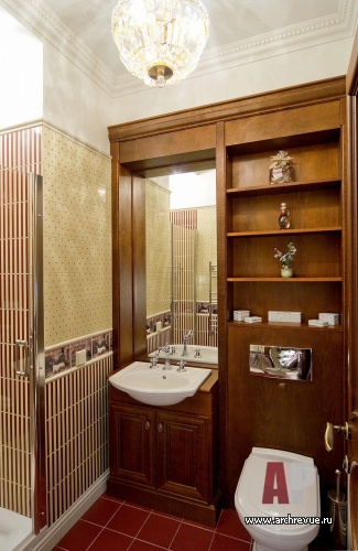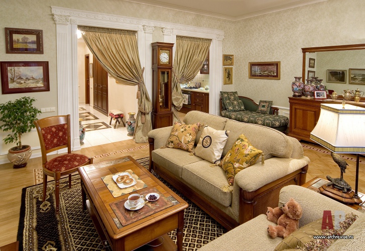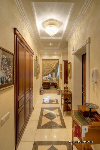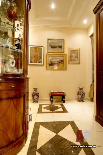 При оформлении старомосковской, классической по духу квартиры авторы старались соблюдать историческую достоверность, выбирая материалы и орнаменты, популярные в конце 18 – начале 19 веков. На полу всех жилых помещений использован традиционный дубовый паркет с кантом в виде древнегреческого меандра. Прихожая и кухня облицованы или натуральным светлым камнем, или плиткой, имитирующей мрамор.