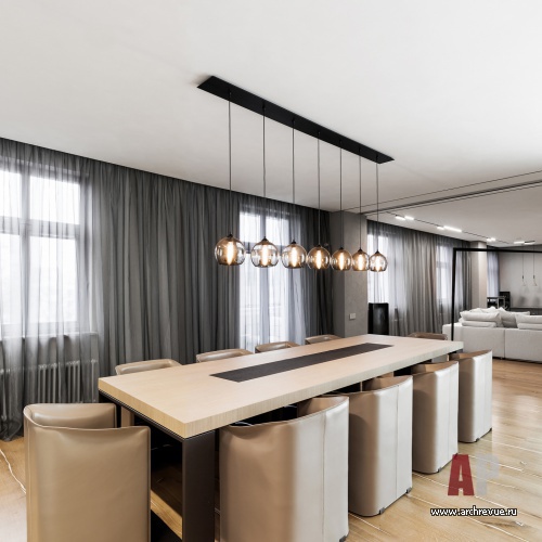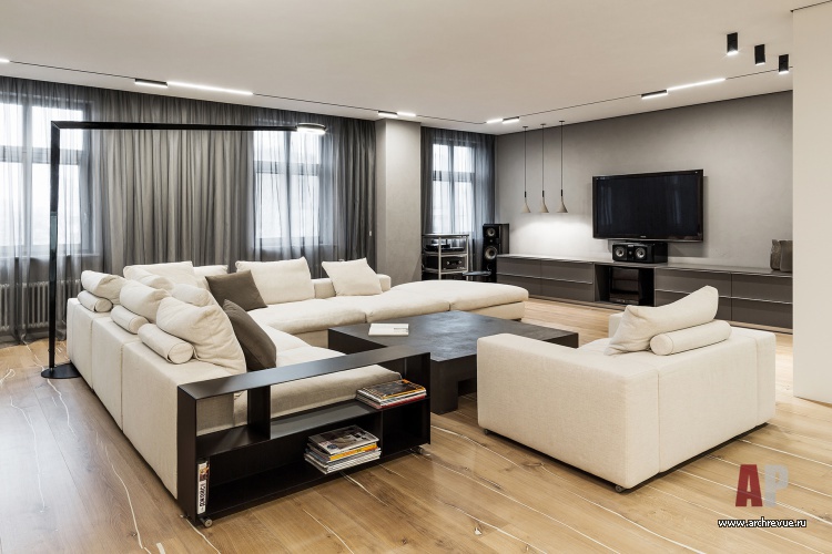 Пятикомнатная квартира площадью более 300 кв. м получилась в итоге объединения двух квартир. Центральное место в ней занимает огромное открытое пространство прихожей-гостиной-столовой-кухни. Изначально раздвижные перегородки не планировались, но заказчик попросил спроектировать возможность изоляции разных по назначению зон.