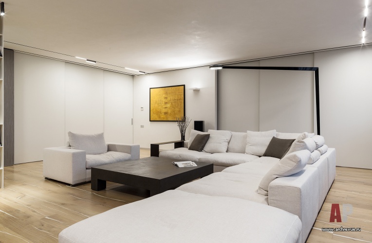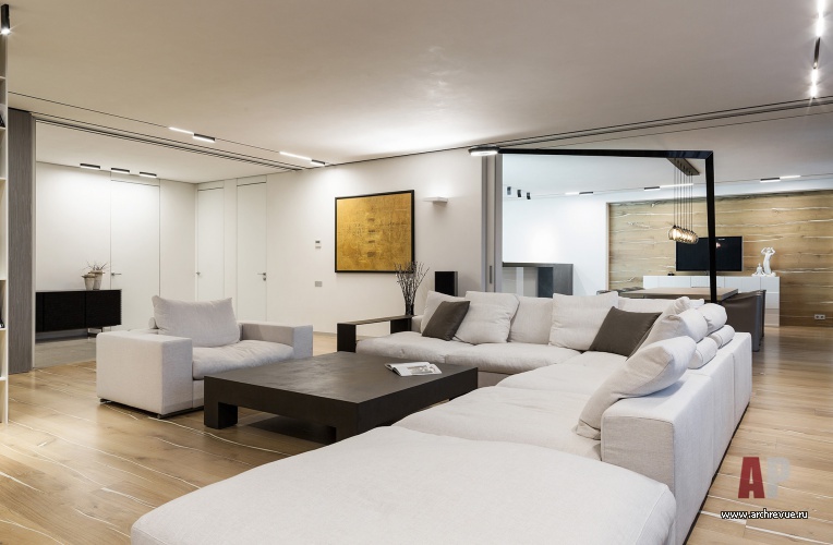 Гостиная диван Flexform, тумба и стеллаж – столярные изделия RIEDL, Pesch