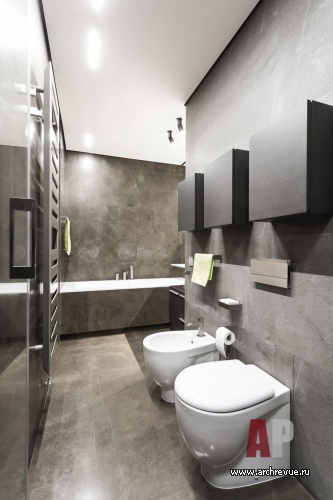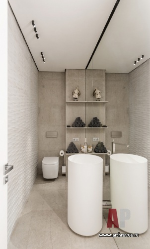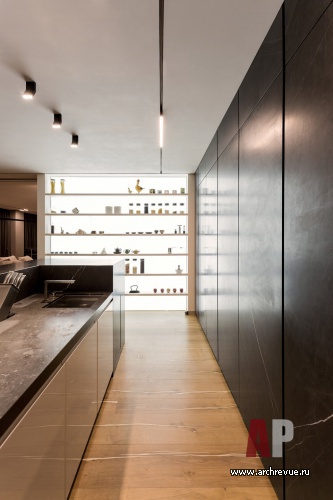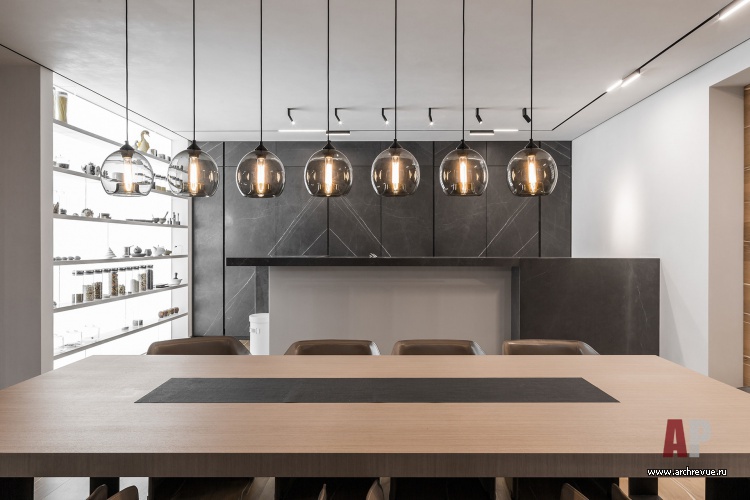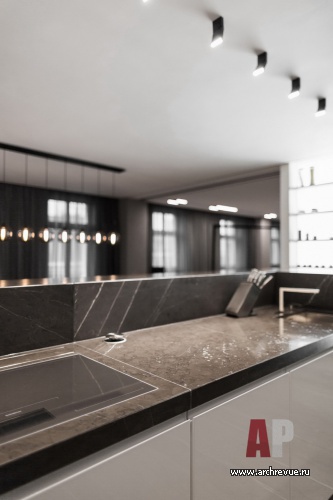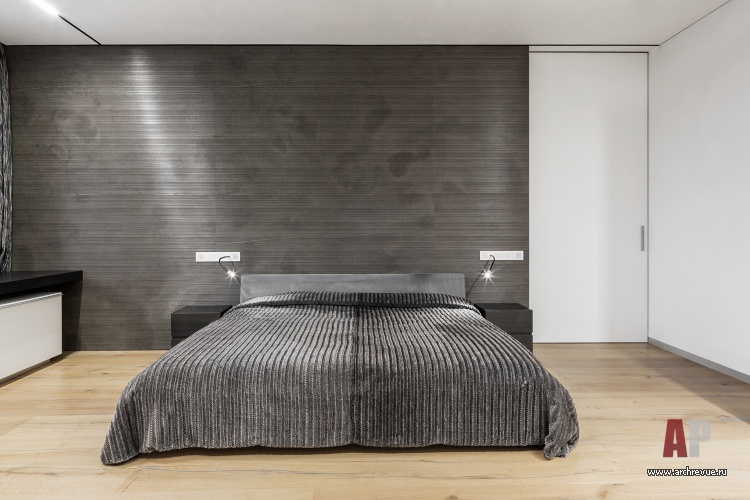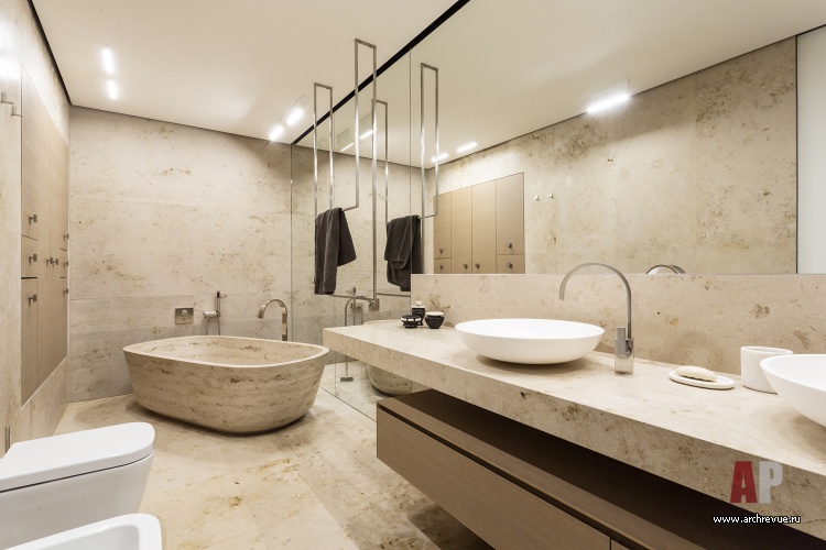 Рельефным камнем облицованы стены хозяйской спальни, санузлов, а также фасады кухонной мебели, которая выглядит как единая закрытая композиция. Важную роль в облике стильного жилья в духе эко-минимализма играет мебель от немецких дизайнеров и световое оборудование. Сочетание технических прожекторов и лаконичных декоративных светильников дает возможность использовать несколько сценариев освещения.
