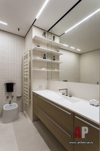 Поэтому были созданы мобильные высокие 3-х створчатые перегородки из белого матового стекла, которые полностью убираются в стены. Особенность планировки приватных помещений (хозяйской спальни и детской) – наличие при каждом помещении своей ванной комнаты и гардеробной. Большая гардеробная расположена также при входе в кабинет.