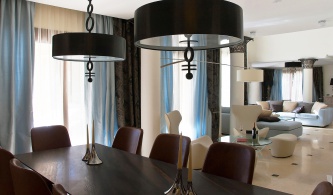 Центральное помещение в четырехкомнатной квартире – общая гостиная, объединенная с кухней и парадной столовой. Большая, удлиненная комната с эркером и глубокими нишами выглядит просторной и светлой. Кабинет-библиотека и две спальни, каждая со своим санузлом, расположены максимально далеко от входа и связаны с парадным холлом коридором.