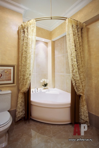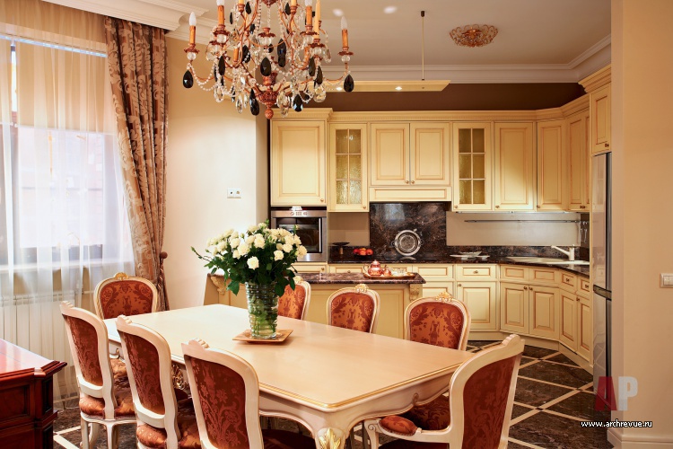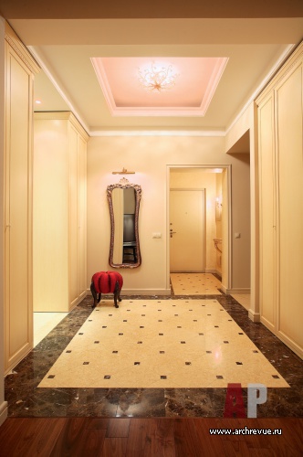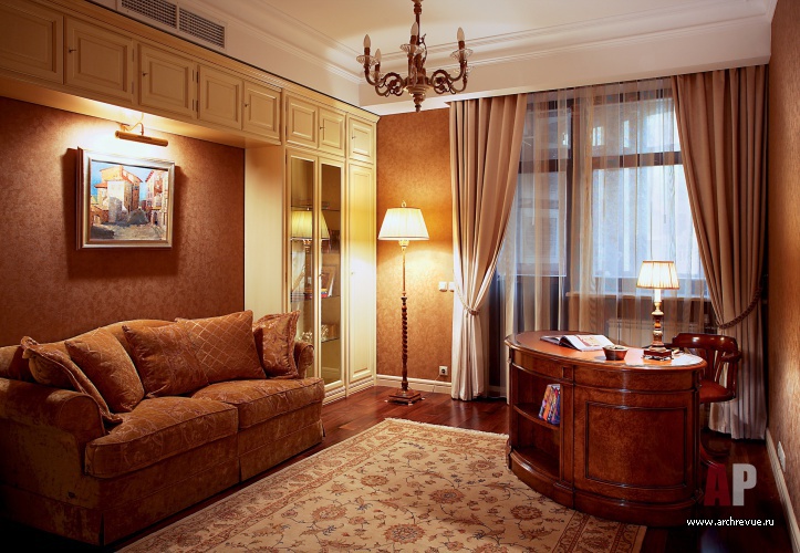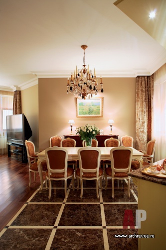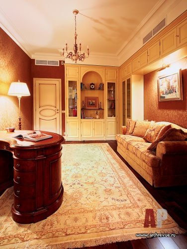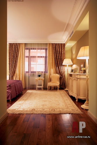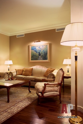 Классическая сущность интерьера гостевой части выражается в использовании традиционных для классики материалов: паркета из натурального ореха, природного мрамора, декоративных финишей золотисто-бежевого цвета, лепного декора из гипса, а также элегантной мебели и светильников. Благодаря такой цветовой гамме интерьер выглядит камерным и уютным.