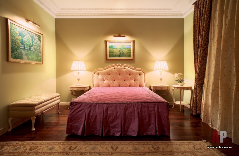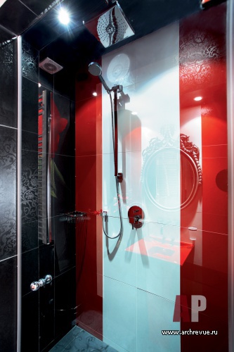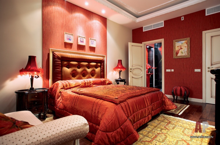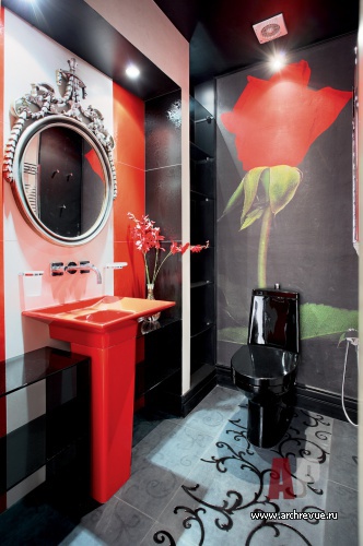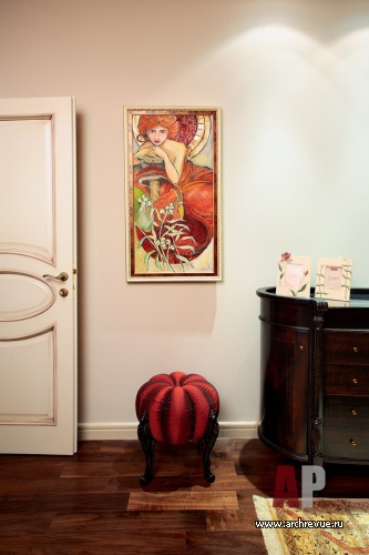 В спальне хозяйки акцент сделан на немного другую цветовую гамму – сложное сочетание нежно-зеленых и розовато-сиреневых оттенков и элементов цвета топленого молока. В спальне дочери неоклассика уступает место ар-деко с контрастной красно-черной цветовой гаммой и глянцевыми фактурами с серебрением.