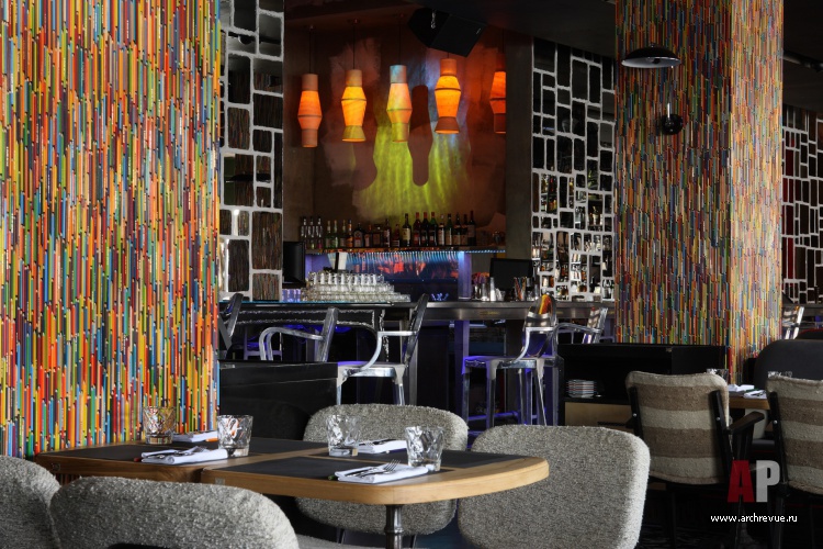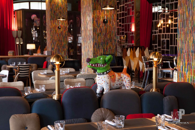 Колонны они облицовывают цветными карандашами, потолки украшают тонкими металлическими трубами с лампочками, между столиками ставят статуэтки собак из цветных шоколадных шариков, а барные зоны и вовсе превращают в импровизированный Лувр или удивительное Зазеркалье.