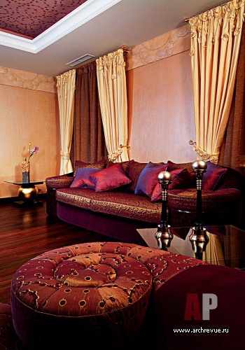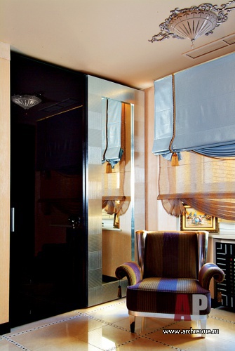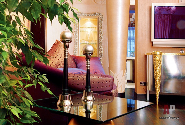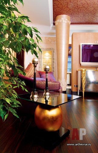 Создавая необычайно декоративный интерьер, дизайнеры используют авторские лепные изделия из гипса. Широкий потолочный фриз с рельефным орнаментом в духе ар-деко украшает практически все жилые помещения (кроме современных детских и кухни). Они оформляют стены многослойными финишами с перламутром, а потолки украшают трафаретной росписью в виде стилизованных цветочных завитков.