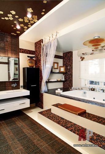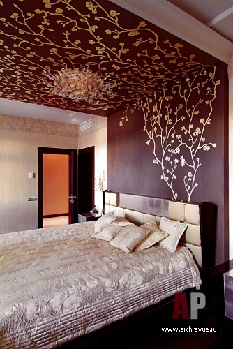 Если гостиная решена в цвете лаванды и спелой сливы, то для хозяйской спальни выбрана шоколадно-золотистая палитра. Главное украшение спальни – декоративная роспись, переходящая со стены за изголовьем кровати на потолок. Ажурный цветочный орнамент выполнен золотом на плотном шоколадном фоне, нарисованные цветы продолжаются в золотом декоре потолочного светильника.