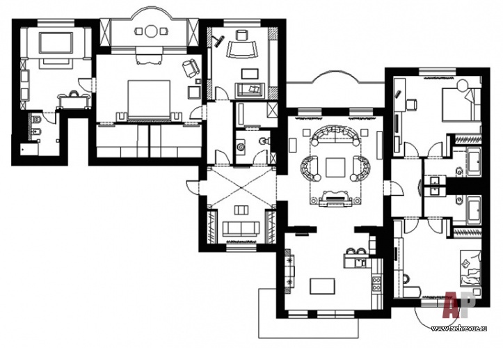 От современной по настроению кухни гостиная отделена небольшим простенком с телевизионной группой и двумя колоннами в виде сужающихся книзу конусов. Из гостиной также можно попасть в маленький холл – буфер между абсолютно симметричными детскими комнатами со своими санузлами.