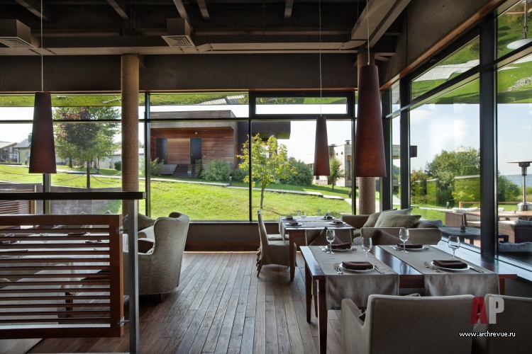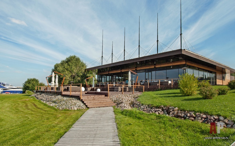 Здание ресторана представляет собой современную постройку с плоской кровлей, деревянной обшивкой и огромными панорамными окнами, залитыми солнечным светом. В нем спроектировано два уровня – две корабельные палубы: на верхней палубе расположен единый большой зал ресторана, посадочные места в нем сгруппированы вокруг центрального бара, вдоль витражных окон.
