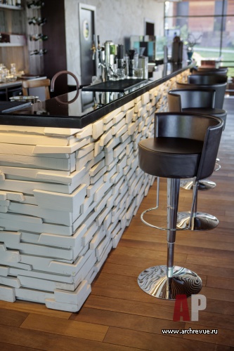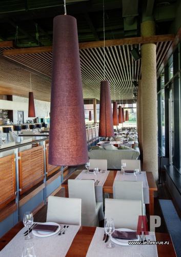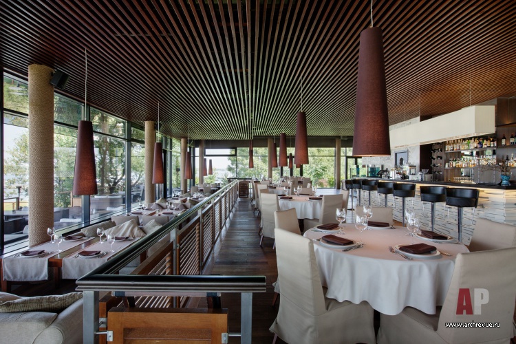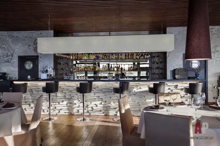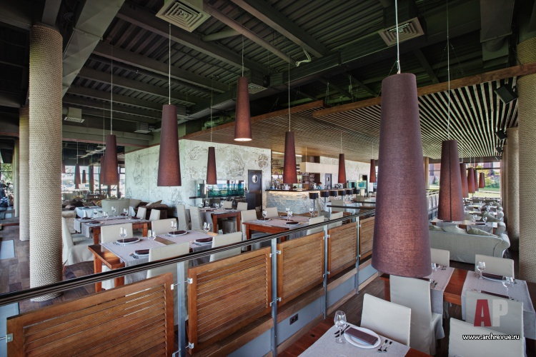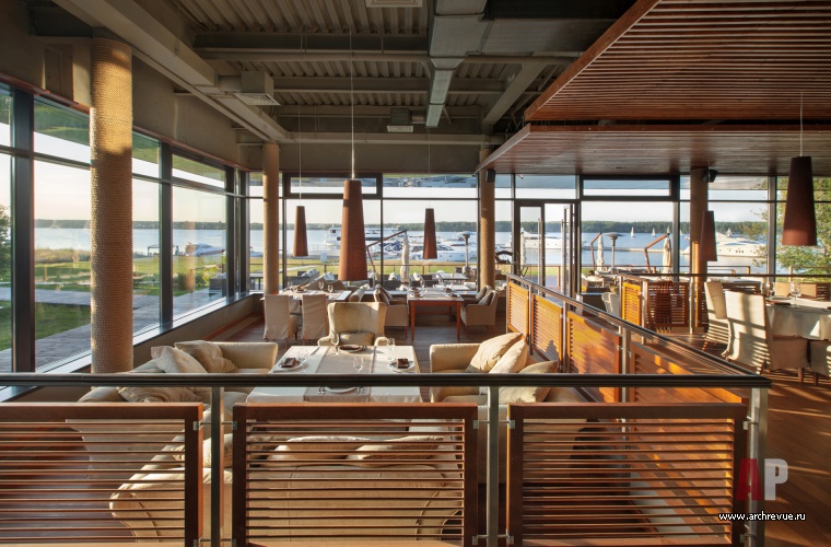 Интерьер ресторана подчеркивает специфику всего яхт-клуба: современный комфорт в гармонии с природой. Корабельная тема прослеживается в выборе отделочных материалов и декоративных деталей. Так, полы в ресторане выстланы массивной доской из древесины кумару, которую наряду с тиком применяют для декорирования яхт. Потолок украшен деревянной перголой, столики зонированы декоративной решеткой из золотистого дуба.