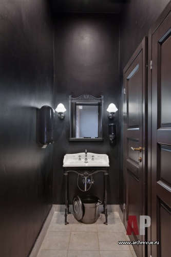 Стены декорированы обоями с изображением старинных декоративных карт, в дверях сделаны окна-иллюминаторы, а несущие колонны обвиты морским канатом.