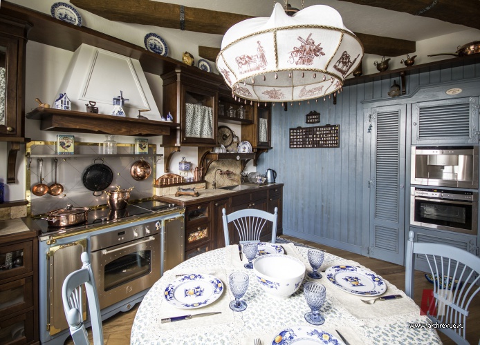 Хотя квартира и расположена на 7 этаже дома-новостройки, в ней создана атмосфера коттеджа на природе. В качестве основной линии оформления был выбран стиль кантри. Гостиная и особенно кухня-столовая и вовсе напоминают альпийское шале. Этому способствует оформленный балками из темного дерева потолок, кухня из темного дерева с винтажной бытовой техникой, коллекция посуды в многочисленных нишах и на отрытых полках по периметру помещения, каменный очаг.