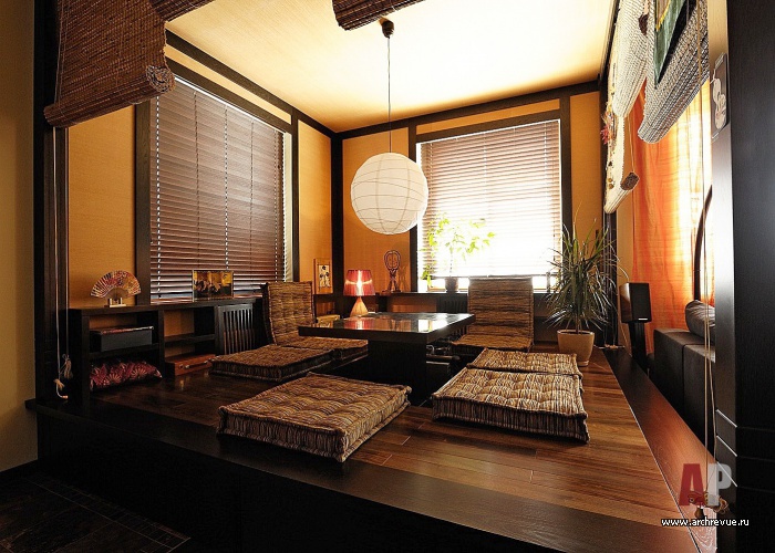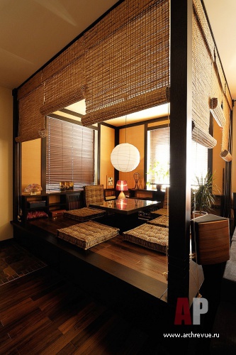 Конструкция из темного дерева высотой 45 см и размером 3,5Х3,5 метра с несущими вертикальными балками и рулонными шторами выполнена в традиционном японском стиле. Сам подиум представляет собой деревянные сиденья, выстроенные по периметру, в центре, где расположен стол, сделано отверстие для ног. В сходной манере исполнена хозяйская спальня. Вдоль двух стен помещения выстроены широкие подиумы, на которых можно сидеть или хранить разнообразные предметы. Вместо штор сделаны декоративные ширмы со стеклом, вдоль стеклянных полотен проложены обои, имитирующие рисовую бумагу.